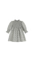 Vestido smock en animal print gris. Nuestro clásico vestido de smock con cuello volantito elevado, con las mangas acabadas en smock también y botonadura trasera.