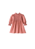 Vestido smock en flores rosas geométricas. Clásico vestido de smock con cuello de volantito elevado, con las mangas acabadas en smock también y botonadura trasera.