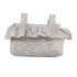 Bolsa de carrito mini con volante de nuestra marca amiga Mimae. Acolchados con una guata de grosor medio, están forrados con algodón orgánico y se cierran con cremallera. Además entre el forro y la guata tiene un tejido impermeable para que el bolso no se empape si se derrama algún líquido.